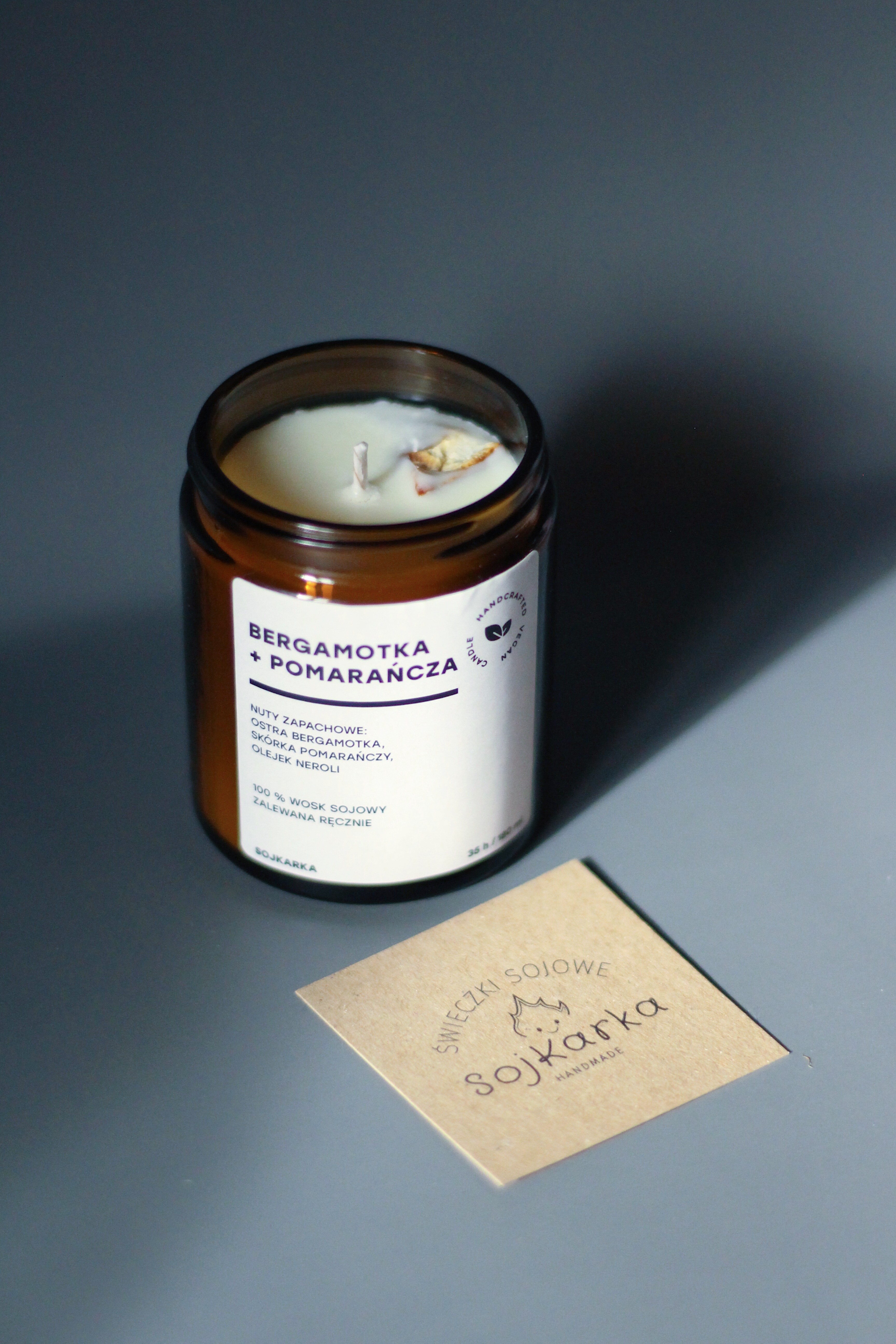 Nuty zapachowe: Świeca Bergamotka + pomarańcza emanuje świeżością i energią dzięki wyjątkowej kompozycji zapachowej, która łączy ostrą bergamotkę, soczystą skórkę pomarańczy oraz olejek neroli. Intensywna bergamotka wprowadza rześką nutę cytrusową, która pobudza zmysły, a skórka pomarańczy dodaje słodkiego, owocowego akcentu. Olejek neroli, z kolei, wprowadza subtelną, kwiatową świeżość, tworząc harmonijną całość.