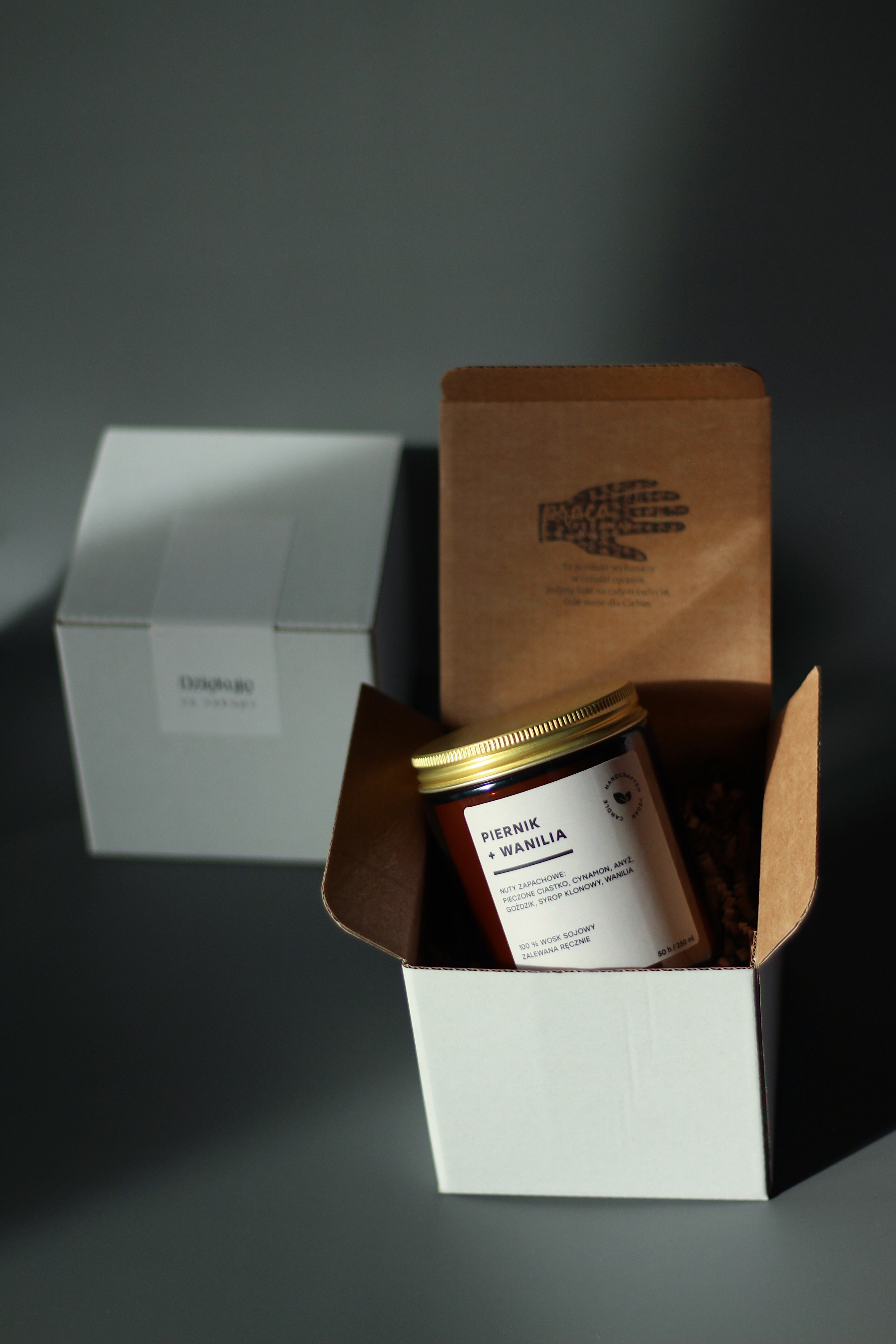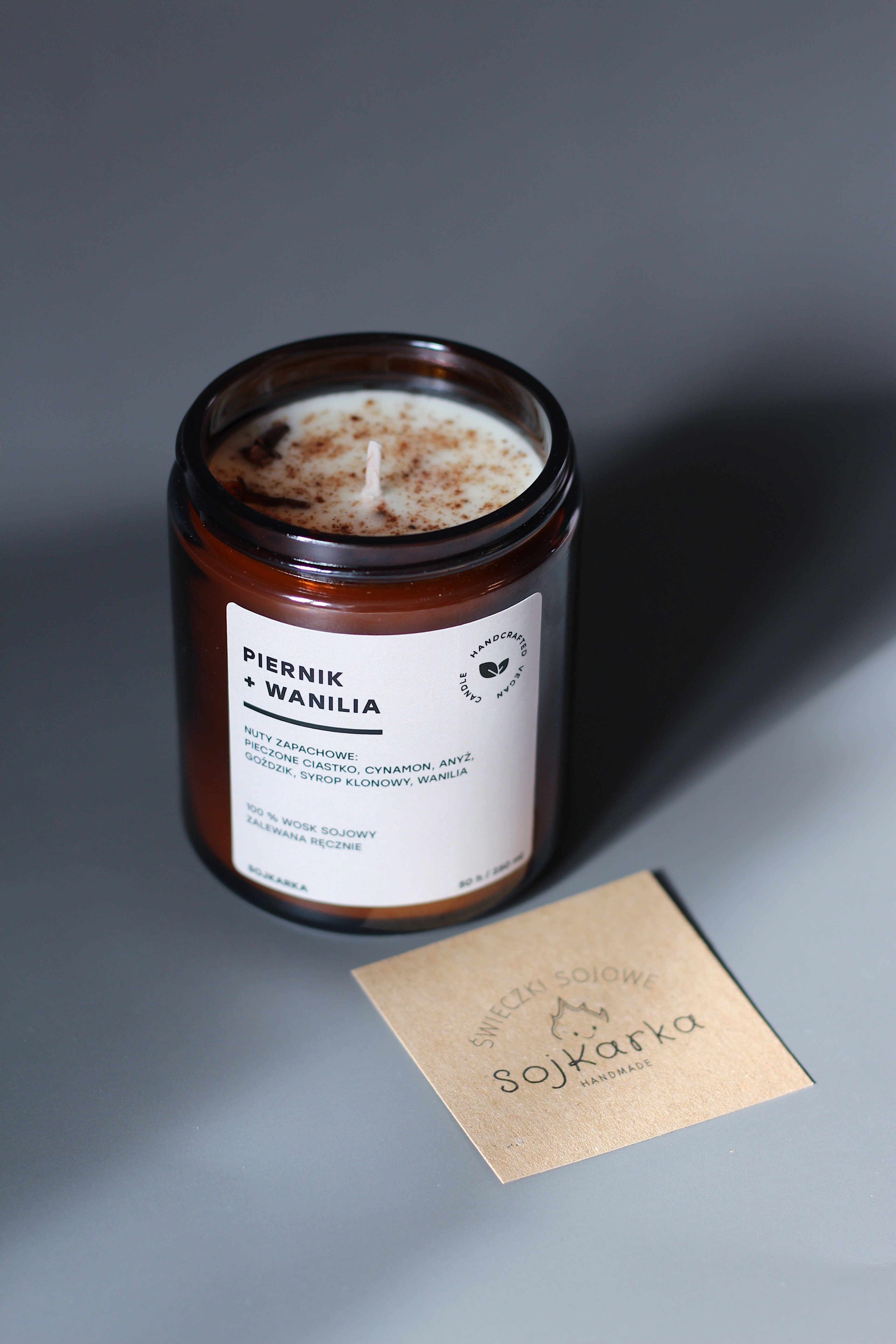 Nuty zapachowe: Świeca Piernik + Wanilia to intensywna nuta pieczonego ciastka wprowadza uczucie domowego ciepła, a cynamon i goździki dodają korzennego charakteru, przywołując świąteczne wspomnienia. Anyż wprowadza subtelny, lekko anyżowy akcent, natomiast syrop klonowy dodaje słodkiej, karmelowej głębi. Wanilia z kolei łagodzi całość, wprowadzając elegancką słodycz. Przeniesie Cię w świat świątecznych wspomnień.